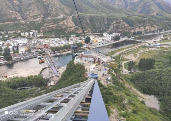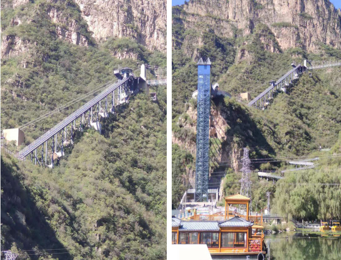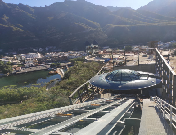 河北省保定市野三坡清泉山景區斜行電梯飛碟,運行長度200米,運行承載重量3噸,運行承載人數40人,